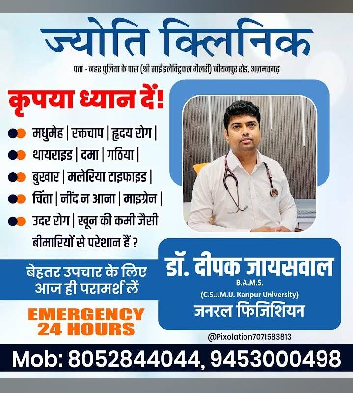 Find Jyoti Clinic near Nahar Puliya, Jiyanpur - Nadwasarai Rd, Azmatgarh, Masona, Uttar Pradesh.